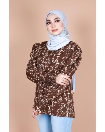 > Muslim Fashion > Tops > QA-867 - Stylish Puff Sleeve Flora Blouse Brown